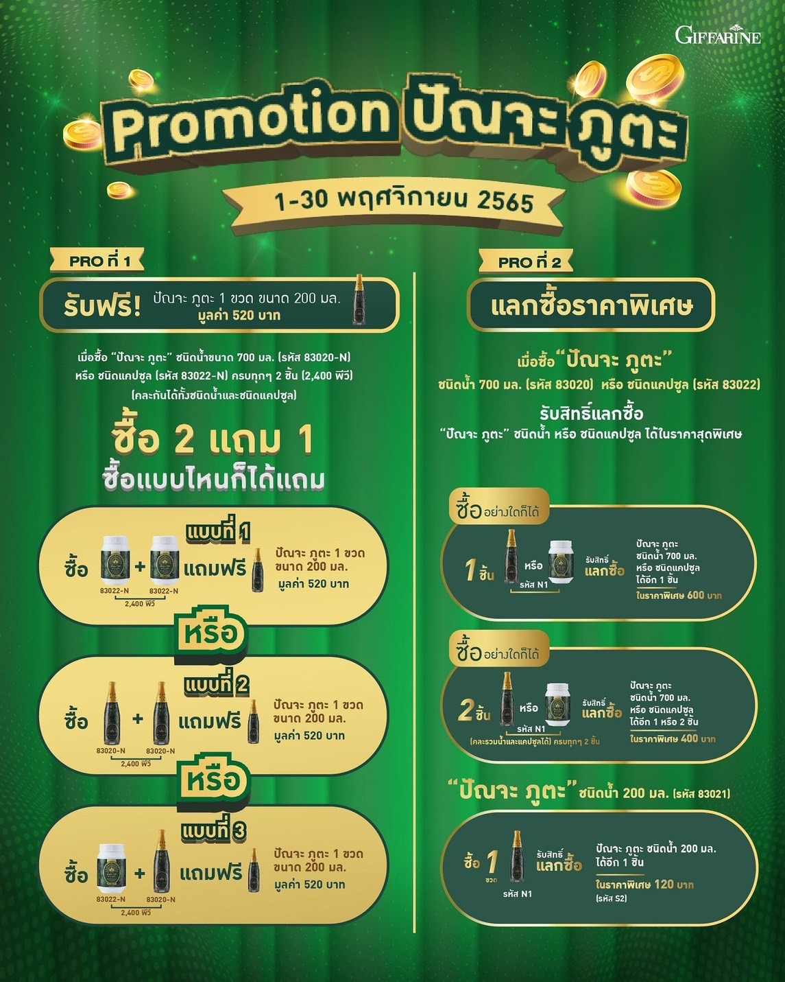 กิฟฟารีน มีโปรโมชั่นมากมาย โปรโมชั่นพิเศษ โปรโมชั่นสิทธิ์แลกซื้อตั้งแต่ 500 PV , 1,000 PV, 1,500 PV  โปรโมชั่น Giff Club และโปรโมชั่นพิเศษ 2,000 PV เลือกรับของแถมฟรี ซึ่งจะมีเป็นช่วงๆ  สามารถติดตามโปรโมชั่นใหม่ๆ ได้ที่นี่
